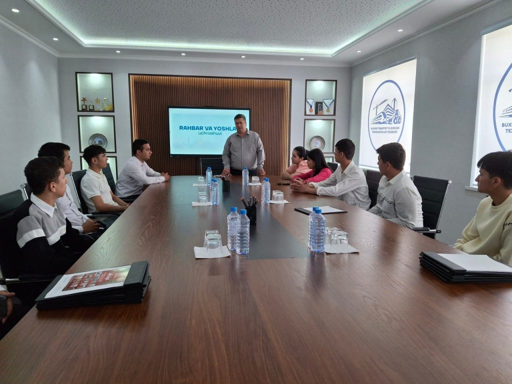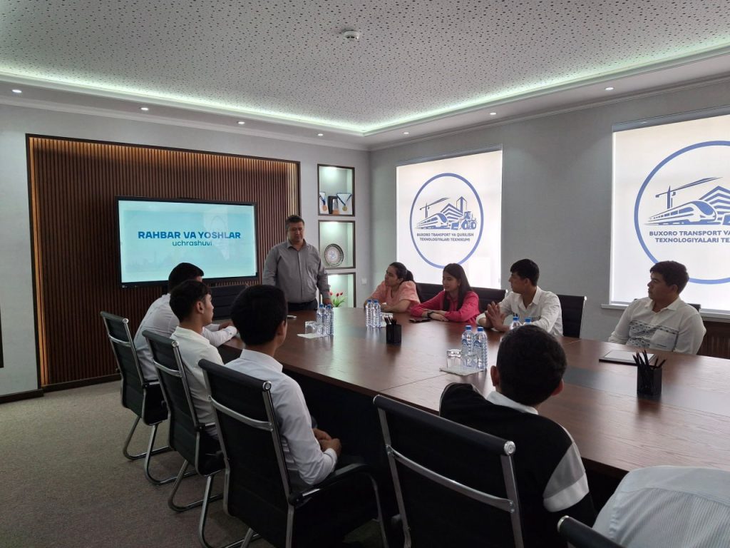 Buxoro transport va qurilish texnologiyalari texnikumida rejaga muvofiq rahbar va yoshlar uchrashuvi o`tkazildi. Uchrashuv davomida texnikum o`quvchilarining qiziqishlari, muammo va takliflari o`rganildi. Yoshlar kelajakda o`z kasbining yetuk mutaxassisi bo`lib yetishishlari uchun ta`lim muassasasi tomonidan kerakli shart-sharoitlar yaratilishi masalalari ilgari surildi. O`quvchilarning zamonaviy kasb, bilim va ko`nikmalarga ega bo`lishlari uchun tajribali o`qituvchi va ishlab chiqarish talimi ustalari biriktirilishi takidlandi.