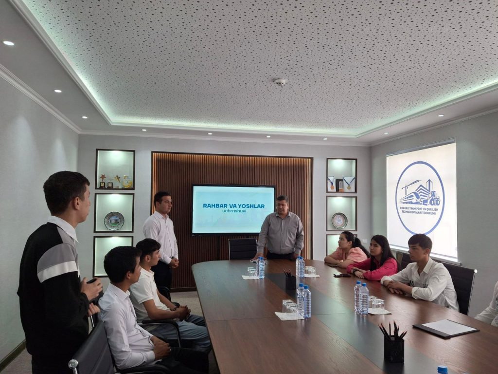 Buxoro transport va qurilish texnologiyalari texnikumida rejaga muvofiq rahbar va yoshlar uchrashuvi o`tkazildi. Uchrashuv davomida texnikum oquvchilarining qiziqishlari, muammo va takliflari organildi. Yoshlar kelajakda oz kasbining yetuk mutaxassisi bolib yetishishlari uchun talim muassasasi tomonidan kerakli shart-sharoitlar yaratilishi masalalari ilgari surildi. Oquvchilarning zamonaviy kasb, bilim va konikmalarga ega bolishlari uchun tajribali o`qituvchi va ishlab chiqarish talimi ustalari biriktirilishi takidlandi.